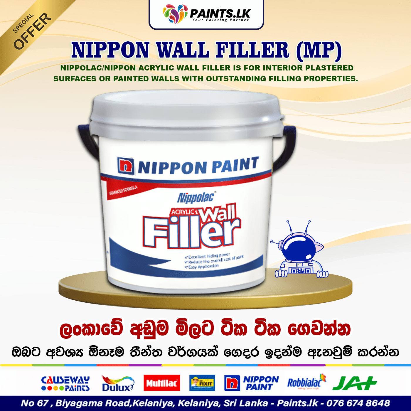 Nippolac/nippon Acrylic wall filler is for interior plastered surfaces or painted walls with outstanding filling properties. It will hide the surface imperfections and help obtain a smooth high quality finish. It will minimize the absorption and save the cost of the first coat of paint.